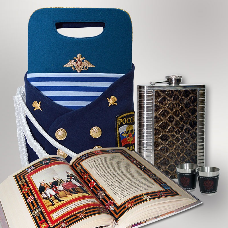 Подарочный набор "ВДВ" — это оригинальный подарок для людей, которые чтут традиции России, её победы и достижения. Внешний вид упаковки (кофр) стилизован под современную военную униформу ВДВ. Такой подход позволил придать подарку неповторимость и очень оригинальный вид. Кофр универсален, он может вмещать в себя любые подходящие по размеру подарки. Продукция уникальна, аналогов нет, это собственная разработка нашей компании. Набор включает в себя подарочный кофр из тонкого войлока, в нём подарочное издание книги "Россия. Наука побеждать" или "1812 год. Россия & Франция", стальную фляжку, две стальные стопки и тельняшку .
